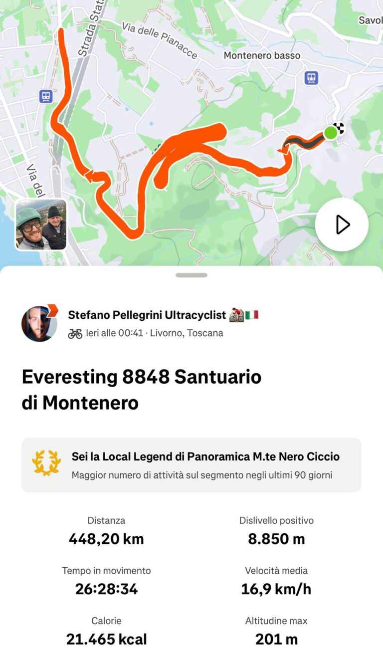 Il 2 marzo alle ore 21:30, l’ultra ciclista Stefano Pellegrini ha portato a termine una delle sfide più estreme nel mondo del ciclismo: l’Everesting 8848. Dopo 54 salite continue e costanti sulla panoramica di Montenero, Pellegrini ha raggiunto l’iconico traguardo, portando per l’ennesima volta l’Everest a Livorno. L’Everesting è una prova di resistenza che consiste nel percorrere un dislivello totale equivalente all’altezza del Monte Everest, ovvero 8.848 metri. Per affrontare questa sfida, gli atleti devono ripetere un determinato percorso fino a raggiungere la quota desiderata, testando non solo la propria forza fisica, ma anche la determinazione mentale. Stefano Pellegrini, già noto per le sue imprese nel mondo del ciclismo estremo, ha dimostrato ancora una volta la sua straordinaria resilienza. La panoramica di Montenero, con le sue curve e il suo dislivello, è stata il palcoscenico perfetto per questa sfida. Con ogni salita, Pellegrini ha affrontato la fatica, il dolore e la monotonia, ma la sua determinazione non è mai venuta meno. “Ogni salita è stata una lotta contro me stesso”, ha dichiarato Pellegrini al termine della sua impresa. “Ma la bellezza del paesaggio e il supporto delle persone che mi circondavano mi hanno dato la forza di andare avanti. È stata un’esperienza incredibile e sono felice di aver portato a casa questo traguardo per Livorno”.