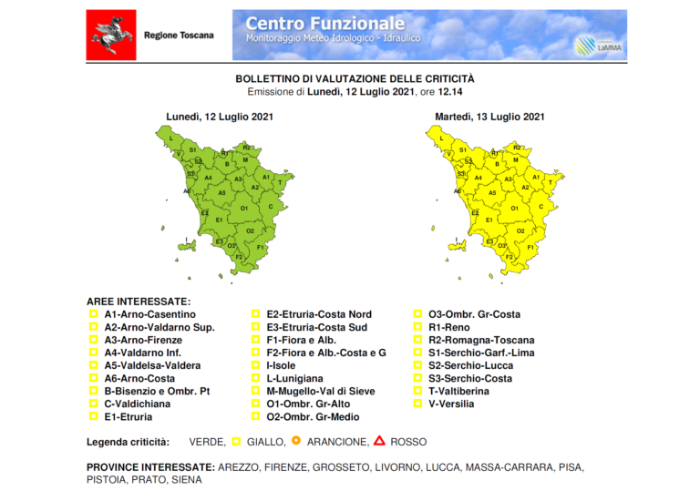 Una rapida perturbazione con temporali anche forti è in arrivo su tutta la Toscana a partire dalle 8 di martedì 13 luglio fino a mezzanotte. Nella stessa giornata, in serata, a partire dalle 20 fino a mezzanotte è previsto mare agitato su tutto l’Arcipelago a nord dell’isola d’Elba e lungo la costa a nord di Piombino. Le isole potranno essere interessate, sempre a nord dell’Elba, anche da forti raffiche di vento. In base al bollettino emesso dalla sala operativa della Protezione civile regionale, ad essere interessata dal codice giallo è anche Livorno dove sono previsti temporali forti e rischio idrogeologico idraulico del reticolo minore dalle ore 08.00 alle 23.59 di domani martedì, 13 luglio. Dalle ore 20.00 sempre di domani fino alle 23.59 sono previste anche forti mareggiate, sempre codice giallo. Raccomandazioni alla cittadinanza.