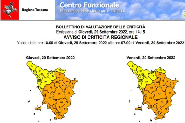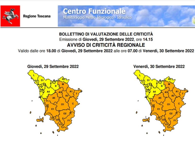 Su tutto il resto della Toscana centrale e meridionale, Livorno esclusa, dalle ore 18 di oggi fino alle 7 del mattino di venerdì 30 sarà invece in vigore un’allerta arancione per forti temporali con rischio idrogeologico e idraulico del reticolo minore.