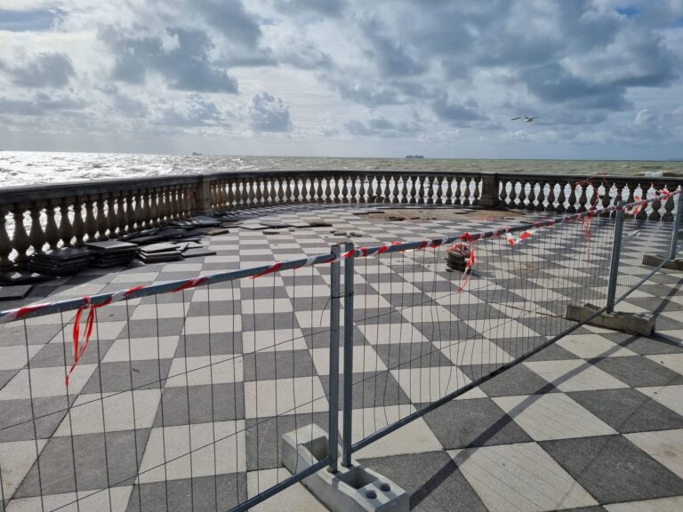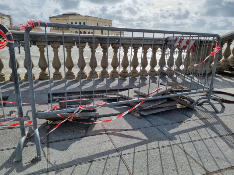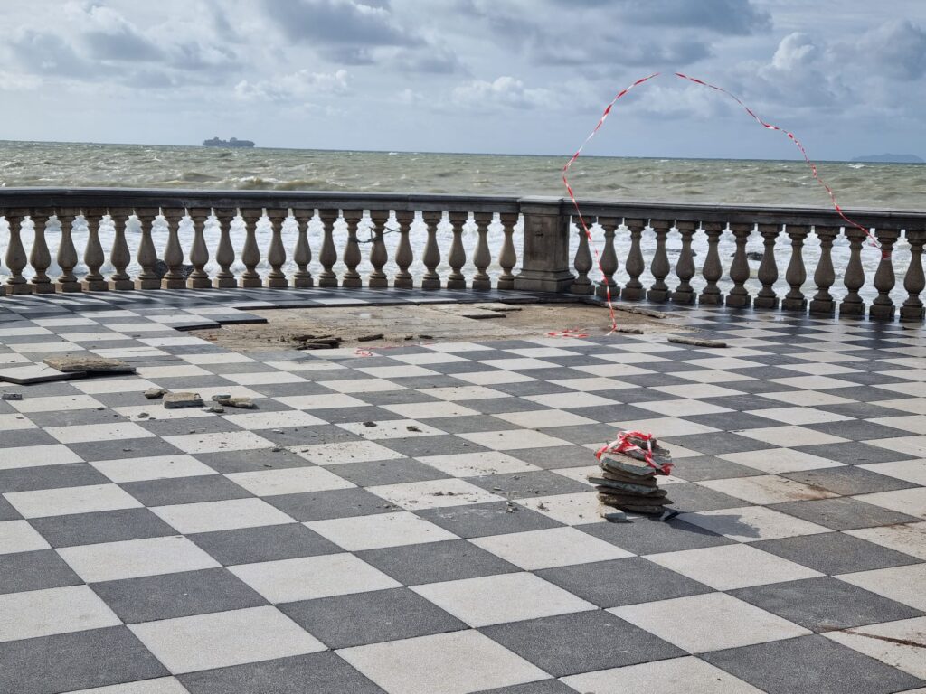 Riaperto il viale Italia intorno alle 10 del 4 novembre, siamo andati a vedere come sta la Terrazza Mascagni dopo la mareggiata. Ed è una Terrazza ferita quella che ci siamo trovati di fronte. Ferita in almeno due punti della scacchiera, entrambi lato Palazzo Pancaldi. Il primo accanto all’arenile dove le onde solitamente si infrangono portando i detriti in strada; il secondo in punta. Anche qui sono saltate alcune mattonelle. In più registriamo lo sradicamento del pannello informativo. I due punti sono stati già transennati. Ora siamo certi che il Comune interverrà al più presto per tutelare uno dei patrimoni e simboli della città. “I danneggiamenti alla Terrazza – fa sapere il sindaco – sono stati già censiti e in somma urgenza si procederà all’intervento di sostituzione delle parti divelte e poi ad un ulteriore programma di manutenzione oltre quello già previsto annualmente”.