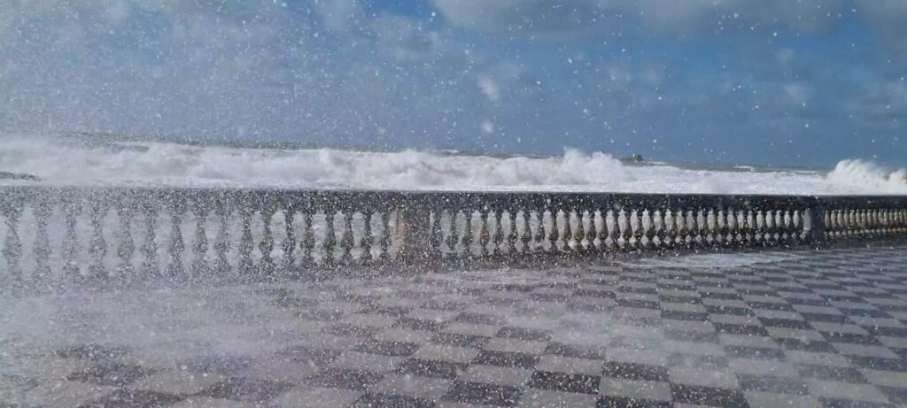 Ecco la Terrazza Mascagni sferzata dalle onde. Ci siamo recati nel luogo simbolo quando ci sono giornate di allerta meteo come oggi e questa è la situazione poco prima delle 13 del 2 novembre (clicca sul link in fondo all’articolo per vedere il VIDEO).