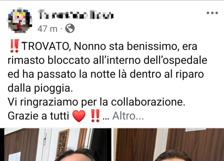 Trovato il sig. Roberto: “Nonno sta benissimo. Grazie a tutti”