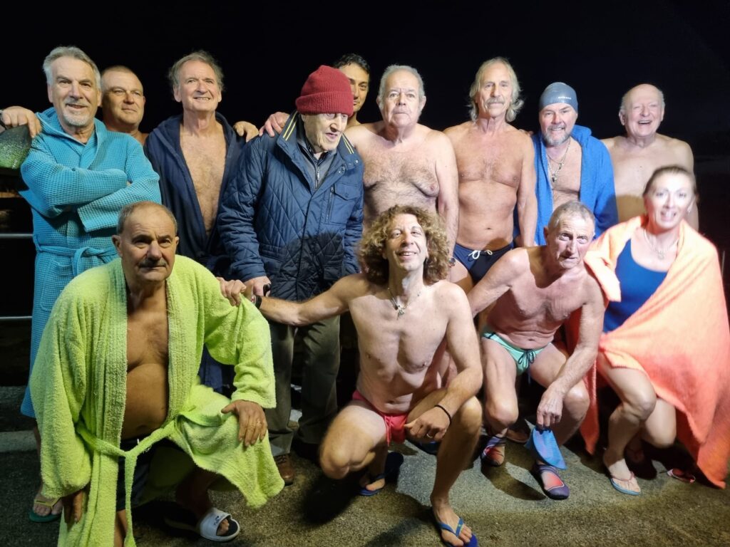 Massimo Volpi, Marco Susini, Carlo Bertocchi, Renzo Orsini, Stefano Franceschi, Mauro Conti, Fabio Cozzolini, Roberto Niccolai, Fabio Pannocchi, Massimiliano Mastalli, Daniela Malfatti, Tullio Serafini, Massimo “Jack” Falleni. Sono stati i partecipanti di quest’anno al tuffo della Merla organizzato al Gabbiano dagli Amici del Gabbiano. Dopo la foto di rito, tutti in passerella. Uno ad uno, chi con la cuffia, chi senza, facendo attenzione a non scivolare, sono entrati nell’acqua gelida rinnovando così una tradizione ultradecennale. Era presente la “mascotte” del gruppo il signor Carlo Bertocchi, fratello del portiere del Livorno negli anni Cinquanta, che proprio oggi festeggia 93 anni. Poco dopo c’è stato il tuffo della Merla degli Amici del Mare agli ex Tre Ponti in ricordo dell’amico Roberto Onorati. Presenti: Giovanni Schiano, Nicola Campolmi, Fabio Barontini, Maurizio Poli, Federica Cozzolino, Corrado Pacini, Massimo del Moro, Alberto Mazzoni, Marco, Donatella e il marito