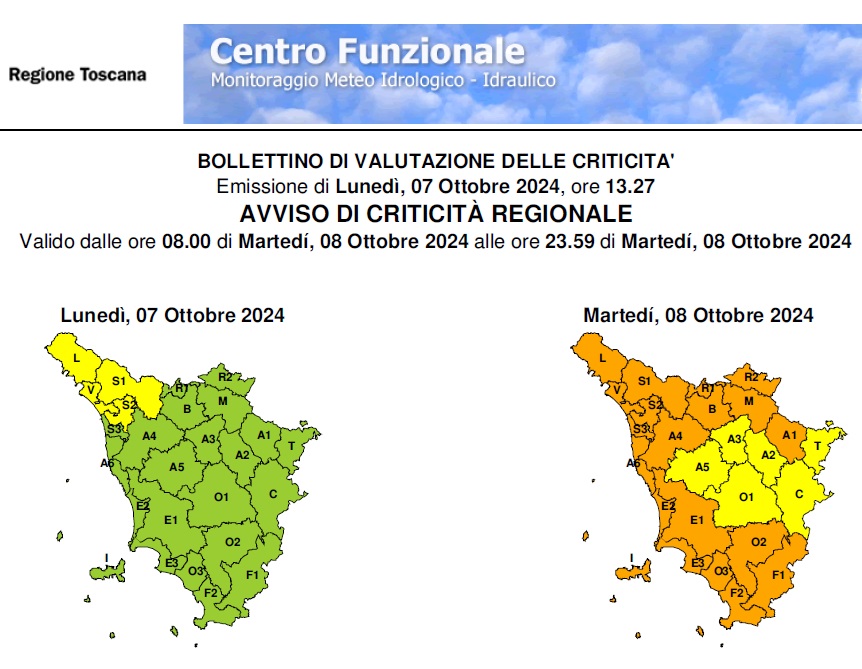 Diramata dalla protezione civile regionale un’allerta arancione per tutta la giornata di martedì 8 ottobre, dalle ore 8 alle 24.00, per rischio idrogeologico e idraulico del reticolo minore e per temporali forti. Per domani, come accaduto il 3 ottobre, è stata decisa la sospensione (restano aperte le segreterie) delle attività didattiche e educative in ogni scuola di ordine e grado e dei servizi educativo-scolastici pubblici e privati. Inoltre, in concomitanza con l’allerta arancione, è stata disposta la chiusura dei centri ludotecari comunali, dei musei comunali, dei centri diurni, dei parchi cittadini, dei cimiteri e del canile comunale.