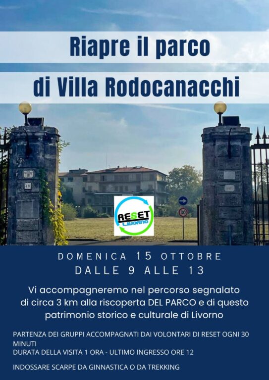E’ ufficiale, riapre al pubblico il parco di Villa Rodocanacchi a Monterotondo. L’appuntamento per tutti gli interessati è per domenica 15 ottobre. I volontari di Reset, l’associazione che ha firmato un patto di collaborazione con la Usl Toscana nord ovest per la manutenzione e gestione del parco per tre anni, accompagneranno i visitatori in un percorso segnalato di circa 3 km alla scoperta del parco patrimonio storico e culturale di Livorno. E’ consigliato indossare scarpe comode. Partenze a gruppi ogni 30 minuti dalle 9 alle 13. Durata della camminata un’ora, ultimo ingresso alle 12.