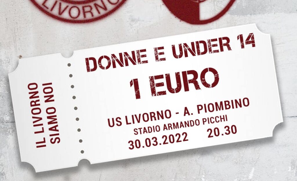 Torna la promozione biglietti a 1 euro in tutti i settori per donne e under 14. L’Unione Sportiva Livorno 1915 (infografica nella foto tratta dalla pagina Fb) ha deciso di ripetere l’iniziativa per la partita Us Livorno-Atletico Piombino, valida come 22esima giornata del campionato di Eccellenza Toscana girone B, in programma mercoledì 30 marzo alle 20.30 allo stadio Armando Picchi. Obbligo di green pass e mascherina Ffp2 per accedere allo stadio