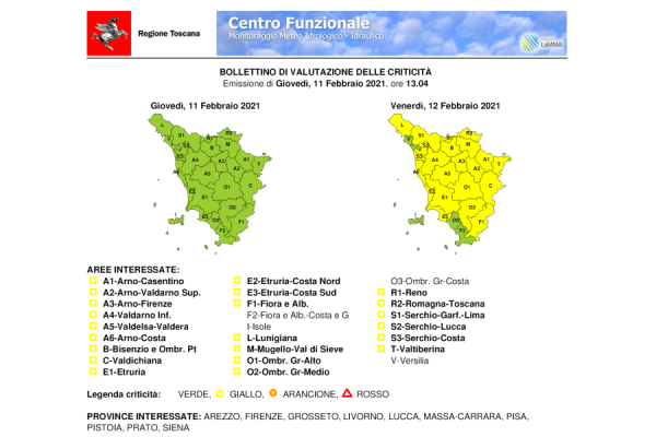 Il Centro Funzionale di monitoraggio meteorologico della Protezione civile regionale ha emanato un avviso di criticità (codice giallo) per vento e neve valido venerdì 12 febbraio, dalle 10 fino a mezzanotte. Per il momento l’avviso riguarda quasi tutto il territorio della Toscana, compresa Livorno, escluse Gorgona e le altre isole dell’Arcipelago. Per venerdì 12 quindi sono previsti venti di Grecale (dai quadranti nord-orientali) e nevicate sparse, a partire dalle ore serali anche a bassa quota.  Relativamente alla criticità per neve non è escluso che venerdì 12, alla luce delle uscite dei modelli, possa essere innalzato il livello di criticità ad arancione in alcune zone.