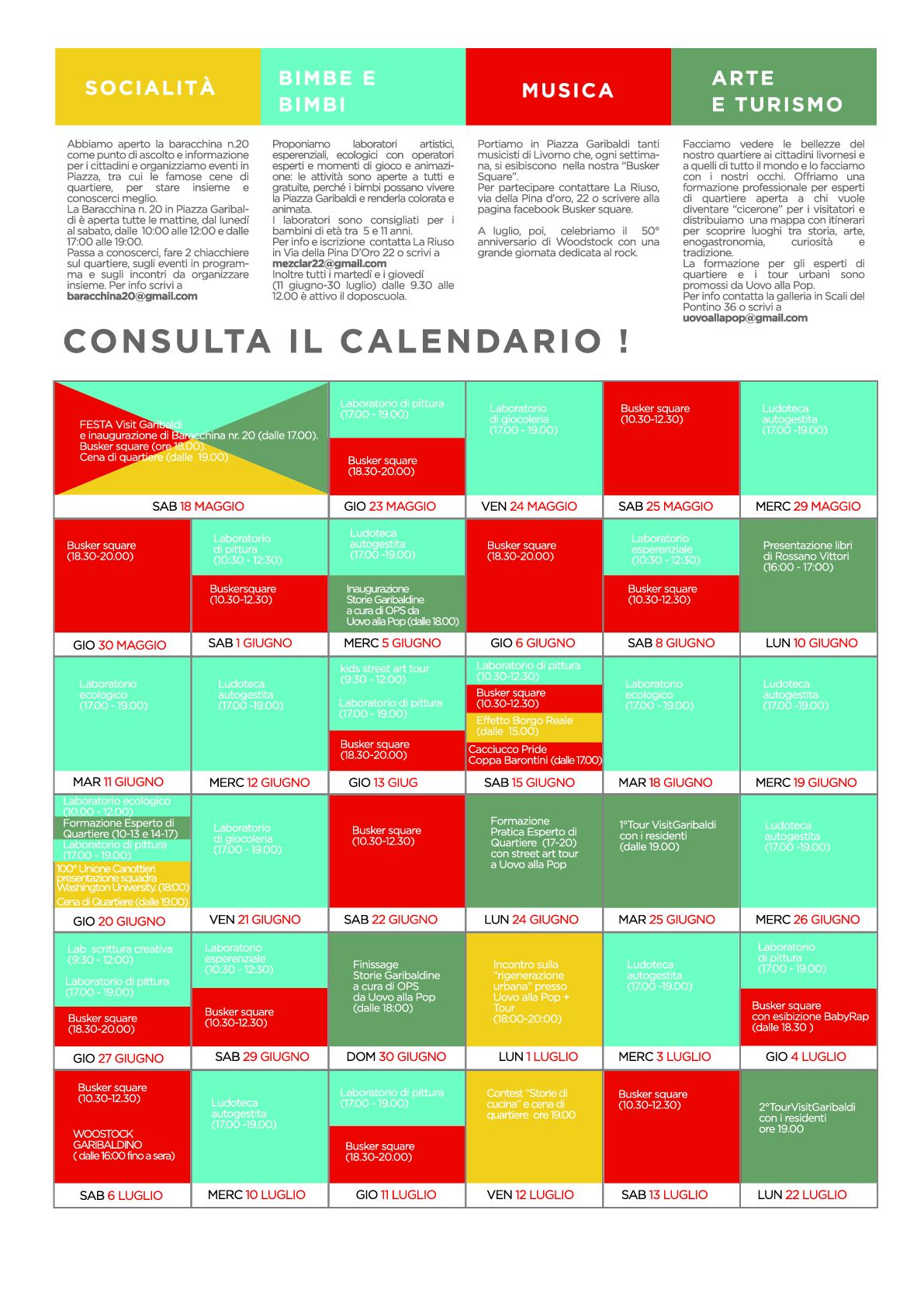 La baracchina n°20Partendo dall’idea condivisa che fosse necessario proporre qualcosa di continuativo che portasse le persone a vivere la piazza e gli spazi pubblici del quartiere – quindi non solo eventi spot ma iniziative ricorrenti, appuntamenti fissi – i protagonisti del progetto hanno capito che Garibaldi ha tutte le potenzialità per diventare una meta per i cittadini livornesi, ma anche per quelli del resto del mondo. Un obiettivo che nasce soprattutto dopo aver ottenuto il neonato marchio transfrontaliero di sostenibilità e identità culturale Quality Made, nato dal progetto S.MAR.T.I.C., di cui la Coop Itinera Progetti e Ricerche è capofila e che lega ben 74 tra imprese e associazioni di 5 regioni (Toscana, Liguria, Sardegna, Corsica e Var in Francia) all’insegna della sostenibilità ambientale, sociale e culturale. Il CCN Antico Borgo Reale, nello specifico, ha ottenuto la certificazione Quality Made per i progetti di sviluppo turistico promossi con i comitati di quartiere Garibaldi e Pontino.