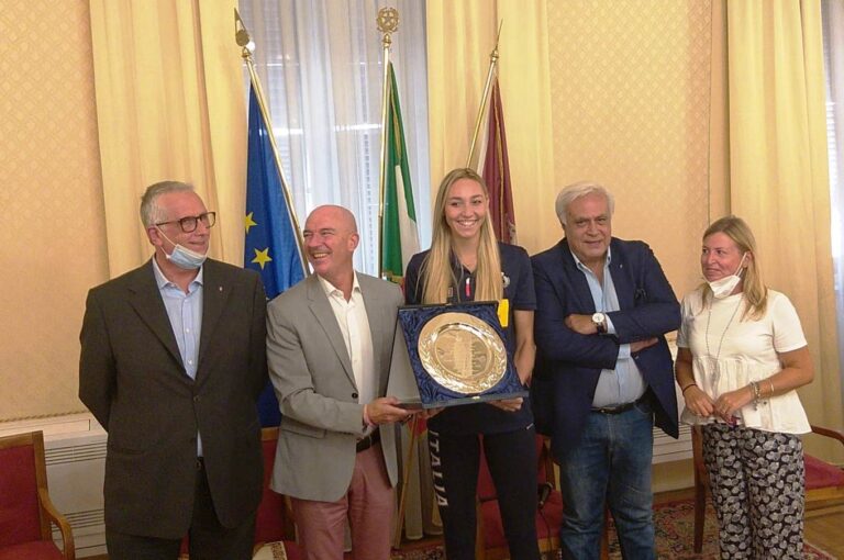 Nel corso della cerimonia il sindaco Salvetti ha consegnato alla giovane e alta atleta (1,90 cm) una pergamena e un piatto inciso, in cui si legge: “Elena Pietrini tenacia, grinta e forza tipicamente labronica, talento indiscusso della squadra vincitrice del titolo Europeo di Volley femminile 2021”.