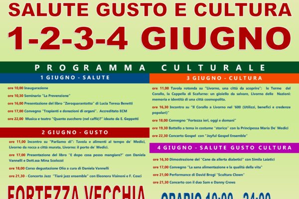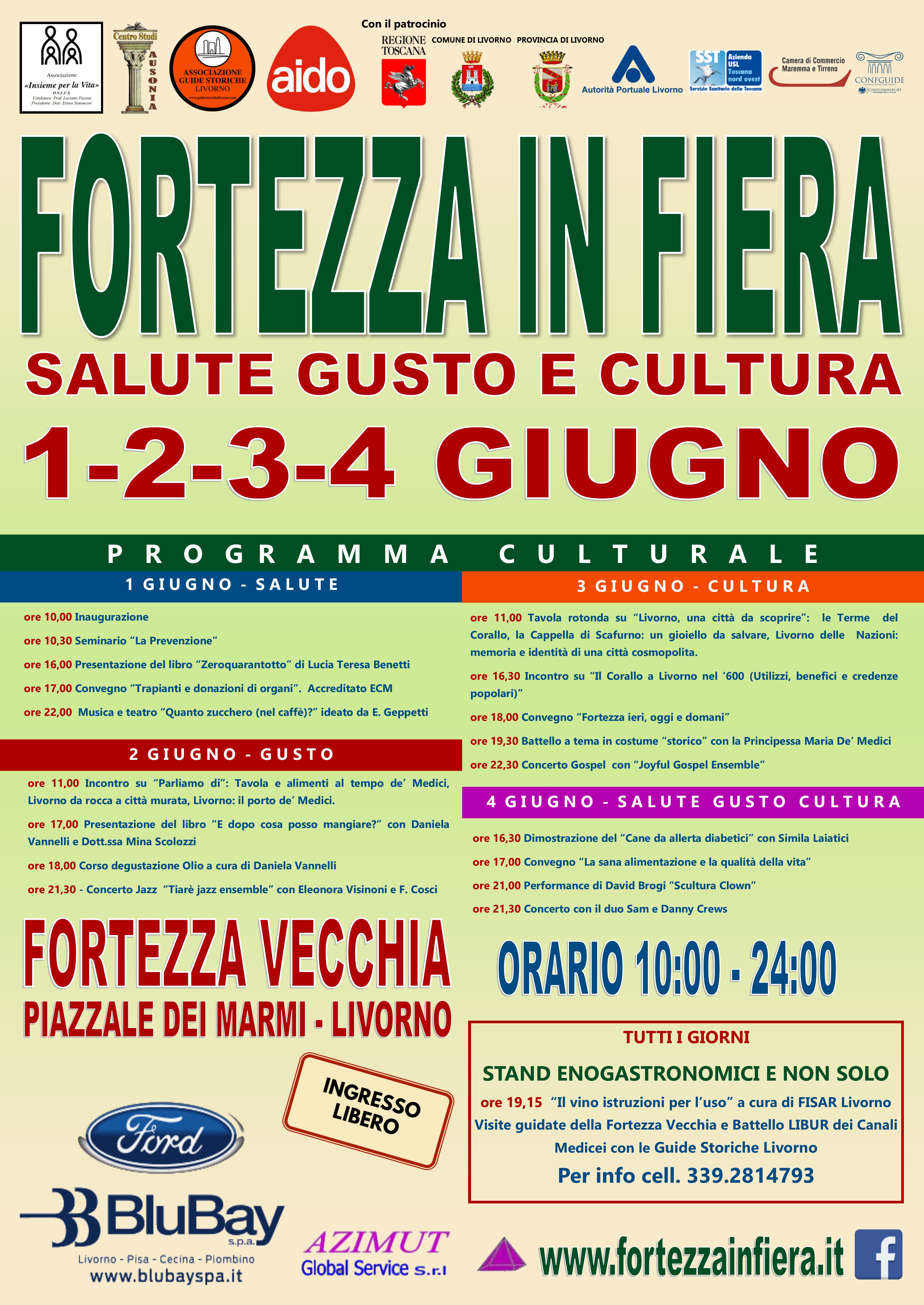 Trapianti e donazioni di organi. Alla sera spettacolo teatrale con Emiliano Geppetti. Il giorno 2, invece, sarà dedicato al Gusto con un incontro al mattino sulla presenza storica della cucina a Livorno al tempo dei Medici, crocevia mondiale di traffici navali mercantili; al pomeriggio presentazione di un libro sulla sana alimentazione e un corso sulle proprietà e degustazione dell’olio. Per il giorno 3 la tematica è quella della Cultura, soprattutto sulla presenza a Livorno di monumenti da scoprire e riscoprire. Al pomeriggio due incontri: uno sul Corallo nel ‘600 (Utilizzi, benefici e credenze popolari) segue un convegno sulla Fortezza Vecchia, la sua storia, il suo presente e il suo futuro. Il 4 giugno, giornata conclusiva, sarà riassuntiva delle tematiche affrontate e terminerà con un incontro sull’alimentazione, dalla dieta mediterranea alle nuove colture a scopo alimentare. Durante tutta la durata della fiera saranno presenti stand espositivi e commerciali a carattere enogastronomico e non soltanto, e la possibilità di visite guidate della Fortezza Vecchia e tour in battello lungo i “fossi”, i caratteristici canali Medicei con le Guide Storiche Livorno e Toscana. Tutti i giorni corso di degustazione “Il vino, istruzioni per l’uso” a cura di FISAR. Tutte le sere spettacoli di teatro, musica e altro. Il giorno 3 lo spettacolo dei “Joyful Gospel Ensamble” verrà posticipato alle ore 22,30 per permettere la visione della finale Champions League su maxi schermo. L’ingresso alla fiera è libero. Per visionare il programma completo, contatti e informazioni: www.fortezzainfiera.it Pagina Facebook Fortezza in fiera