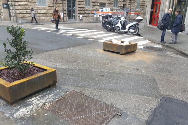 I tecnici del Comune sono intervenuti questa mattina per svuotare e rimuovere la fioriera montata sul lato sinistro di via Ricasoli all’incrocio con piazza Attias, danneggiata nella notte tra domenica e lunedì.
