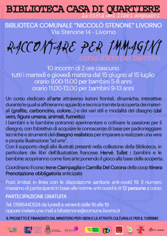 Un corso dedicato all’arte attraverso lezioni frontali, dinamiche, interattive durante le quali si affineranno sguardo e tecnica tramite la scoperta dei materiali (grafite, carboncino, colore…) e dei vari stili e modalità del disegno (dal vero, figura umana, animali, fumetto). I bambini e le bambine potranno sperimentare e coltivare la passione per il disegno, con l’obiettivo di acquisire le conoscenze di base per padroneggiare tecniche e strumenti del disegno realistico per imparare a realizzare una vera e propria illustrazione “ad arte”. Durante le lezioni i partecipanti saranno invitati a sperimentare diversi materiali e diverse tecniche artistiche. Con il supporto degli albi illustrati presenti nella collezione della Biblioteca, in particolare dei libri dell’illustratore francese Hervé Tullet i bambini e le bambine scopriranno come fare arte ponendo il gioco alla base della scoperta. L’iniziativa coordinata da coop.Itinera fa parte del progetto La Città dei libri sognanti: Biblioteca Casa di Quartiere, promosso dal Comune di Livorno e finanziato dal Ministero per i beni e le attività culturali.