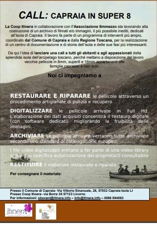 La Coop Itinera in collaborazione con l’Associazione 8mmezzo sta lavorando alla costruzione di un archivio di filmati e/o immagini, il più possibile inediti, dedicati all’Isola di Capraia. Il lavoro fa parte di un programma di interventi più ampio, coordinato dal Comune di Capraia e dalla Regione Toscana e portato avanti da Itinera, per la realizzazione di un centro di documentazione e di storia dell’isola e delle sue fasi più interessanti.