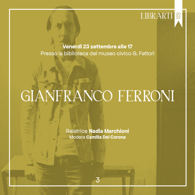 Venerdì 23 settembre alle ore 17 si terrà il terzo appuntamento di LibrArti dedicato a Gianfranco Ferroni. Relatrice dell’incontro è Nadia Marchioni, docente di Storia dell’arte contemporanea e Storia del costume all’Accademia di Carrara, è autrice di numerosi saggi e articoli scientifici e curatrice di importanti progetti espositivi, tra cui Gianfranco Ferroni. Prima e dopo la Biennale del ’68. Tutto sta per compiersi (dall’8 luglio al 16 settembre 2018 a Palazzo Mediceo di Seravezza) e Mario Puccini. Van Gogh involontario (dal 2 luglio al 19 settembre 2021 al Museo della Città di Livorno).