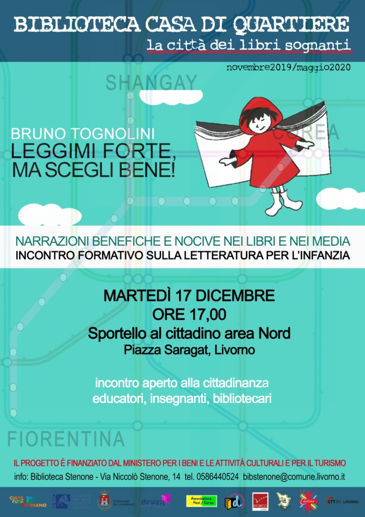Appuntamento da non perdere martedì 17 dicembre per gli insegnanti, educatori, bibliotecari, genitori. Al Centro Servizi al cittadino Area Nord, piazza Saragat 1 quartiere Corea a Livorno (accanto al supermercato Pam) si svolgerà alla ore 17 un incontro con lo scrittore Bruno Tognolini dal titolo Leggimi forte, ma scegli bene! Narrazioni benefiche e nocive nei libri e nei media incontro formativo sulla letteratura per l’infanzia. L’incontro gratuito ed aperto a tutti (in fondo all’articolo trovate la scheda dell’incontro) si inserisce nell’ambito del progetto Biblioteca casa di quartiere: la città dei libri sognanti, promosso e finanziato dal ministero per i beni e le attività culturali e per il turismo, in collaborazione con il Comune di Livorno.