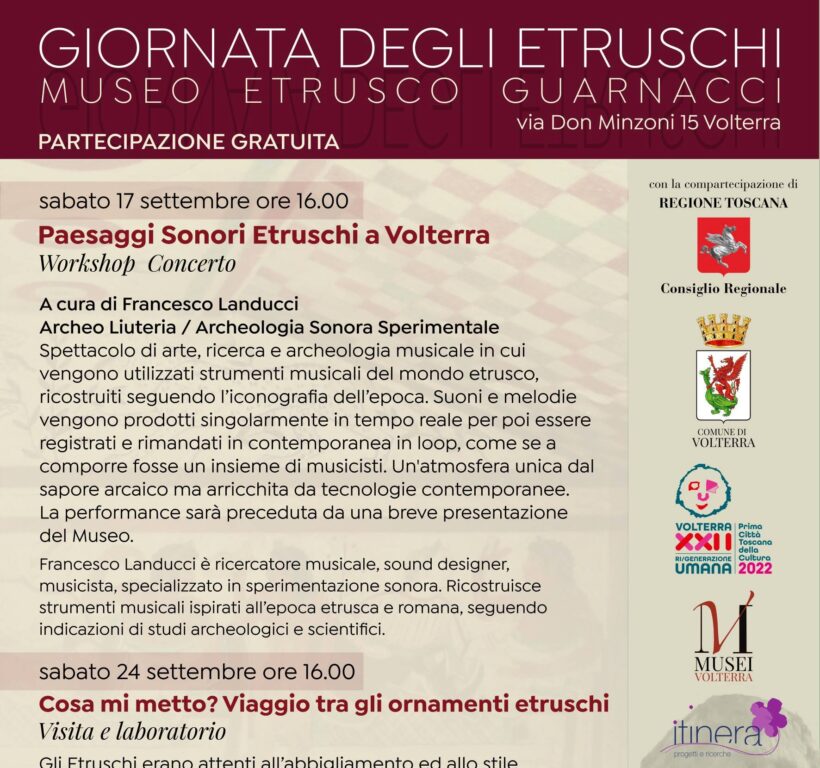 Nell’anno di Volterra 22 prima Città toscana della Cultura, il Museo Guarnacci ospiterà l’evento “Paesaggi Sonori Etruschi a Volterra” un Workshop -Concerto a cura di Francesco Landucci. Spettacolo di arte, ricerca e archeologia musicale in cui verranno utilizzati strumenti musicali del mondo Etrusco.