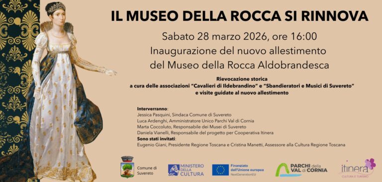 Sabato 28 marzo alle ore 16:00, è prevista l’inaugurazione del nuovo allestimento del Museo della Rocca Aldobrandesca di Suvereto, alla presenza della Sindaca Jessica Pasquini, dell’Amministratore Unico Parchi Val di Cornia SpA Luca Ardenghi, della Responsabile dei Musei di Suvereto Marta Coccoluto e della Responsabile del progetto per Cooperativa Itinera Daniela Vianelli; sono stati invitati Eugenio Giani, Presidente Regione Toscana e Cristina Manetti, Assessore alla Cultura Regione Toscana.