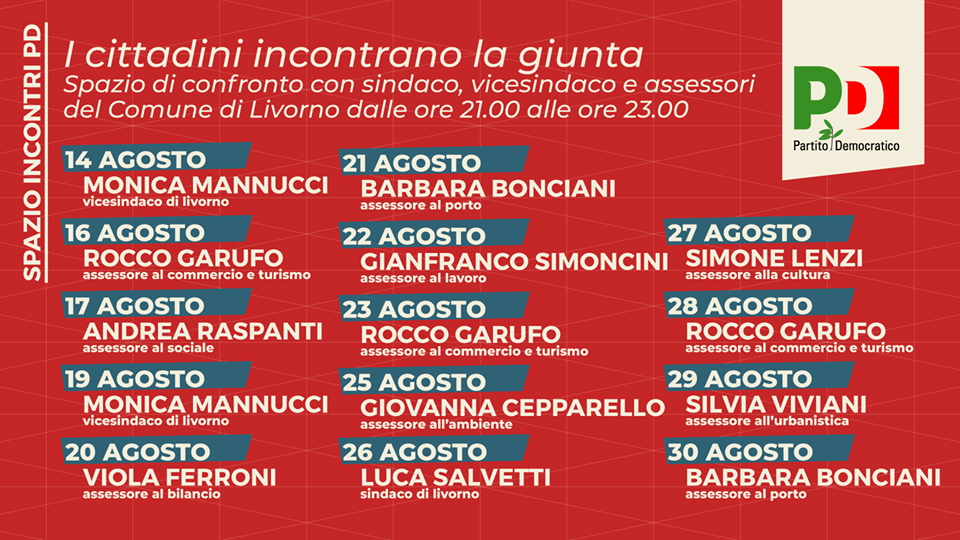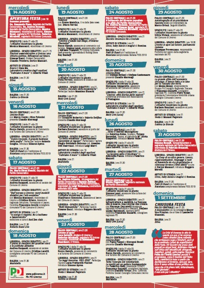 Dal 14 agosto al 1° settembre 2019 la Rotonda d’Ardenza sarà animata dalla Festa de l’Unità 2019 (in fondo all’articolo il programma politico e degli spettacoli). “Livorno si apre” è la frase scelta per rappresentare il tradizionale appuntamento estivo del Pd. Uno slogan che, come afferma il segretario del Pd livornese Federico Mirabelli “vuole dare continuità alla nostra recente campagna elettorale per le amministrative. Livorno ha avuto la forza di guardare oltre. Livorno si apre”. Sono attesi numerosi ospiti tra cui, oltre al sindaco Luca Salvetti, il segretario Nicola Zingaretti e l’ex ministra Maria Elena Boschi. Numerosi saranno gli incontri ed i dibattiti su temi di attualità e politica (anche insieme ai Giovani Democratici) oltre a spettacoli e buon cibo. “La crisi di governo che si è aperta – sottolinea Adriano Tramonti, organizzatore della festa – ci ha sorpreso, sicuramente non a livello politico ma unicamente dal punto di vista organizzativo. Gli incontri che avevamo pensato relativi ad alcune tematiche dovranno essere rivisitati in un’ottica di maggiore attualità e pertinenza”.