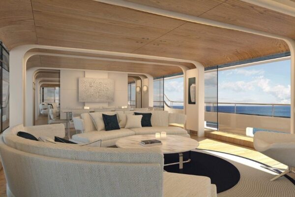 Lo yacht ospita 12 persone in 6 cabine e ha un Sun Deck tra i più ampi della categoria: grazie a una lunghezza di oltre 20 metri, questo ponte ospita infatti una infinity pool lunga 5 metri e profonda 1,5, una palestra, una pantry, un bagno, un mobile bar, un tavolo per 10 persone e una zona prendisole che può essere trasformata in un cinema all’aperto. La sky lounge dell’Upper Deck si integra perfettamente con gli spazi esterni di poppa mentre all’interno, sullo stesso ponte, una massagge room convertibile in cabina doppia vip precede la timoneria, l’adiacente ship office e, sul lato sinistro della nave, la cabina del comandante e una pantry. A poppa del Main Deck un’area all’aperto è dedicata al relax. Negli ambienti interni, a centro nave, la zona giorno può essere trasformata in una sala cinema e la suite armatoriale contempla anche un salottino lounge e un balconcino privato.