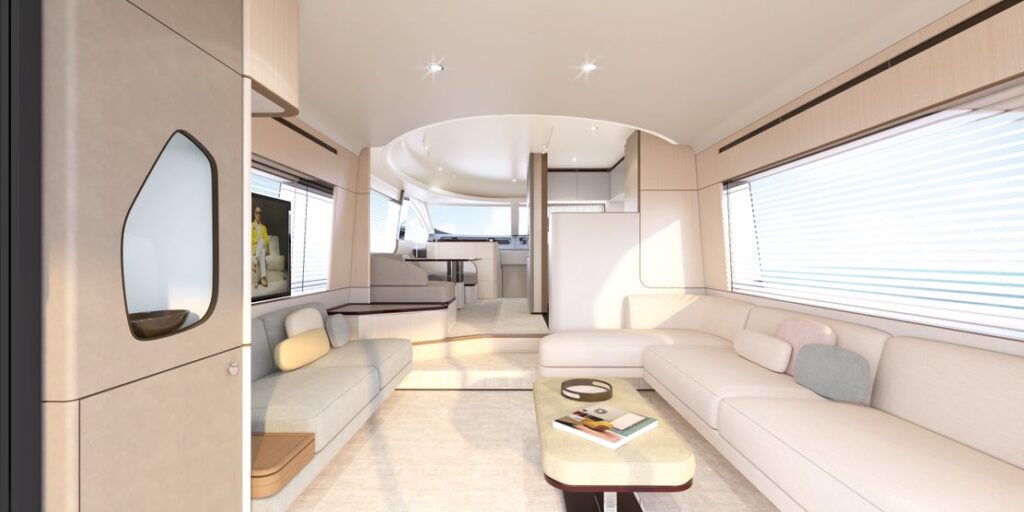 Nella categoria di yacht di lunghezza compresa tra i 45 e i 64 piedi (da 13,70 fino ai 19,50 metri) Azimut 53 Fly ha vinto il premio Best Interior Design. Progettato per offrire a una famiglia la possibilità di organizzare lunghi soggiorni a bordo in piena comodità, grazie anche a un significativo ampliamento sia dello spazio di bordo che della sua percezione, il 53 Fly si distingue per una zona giorno disposta quasi su un unico piano: la cucina e la zona living sono infatti separate da un dislivello di appena 25 centimetri e ne deriva un importante senso di ariosità e di libertà di movimento, esaltato dalle vetrate laterali che, superata la zona di ingresso, corrono ininterrotte fino al parabrezza. Molto ampia anche la zona notte, che si caratterizza per una grande suite armatoriale a centro barca e una cabina VIP particolarmente agevole, molto al di sopra della media di mercato come offerta di spazi storage e passaggio tra letto e paratia.