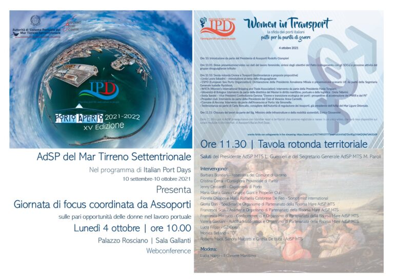 Organizzata in modalità streaming nell’ambito del progetto di apertura del porto alla città, Porto Aperto, la sessione avrà luogo a partire dalle 11.30. Previsti i saluti del presidente e del segretario generale dell’AdSP, Luciano Guerrieri e Matteo Paroli. Interverranno tra gli altri l’assessora comunale al porto, Barbara Bonciani ed esponenti femminili del mondo istituzionale ed economico locale.