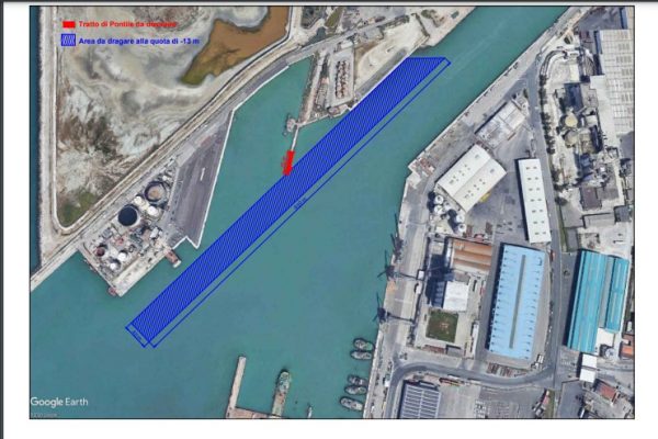 L’intervento è prodromico all’esecuzione del dragaggio di 80.000 mc di sedimenti che servirà a rimodellare il fondale a una profondità di 13 metri su un’area di circa 24 mila mq, con un ulteriore riprofilamento del canale di accesso alla darsena toscana