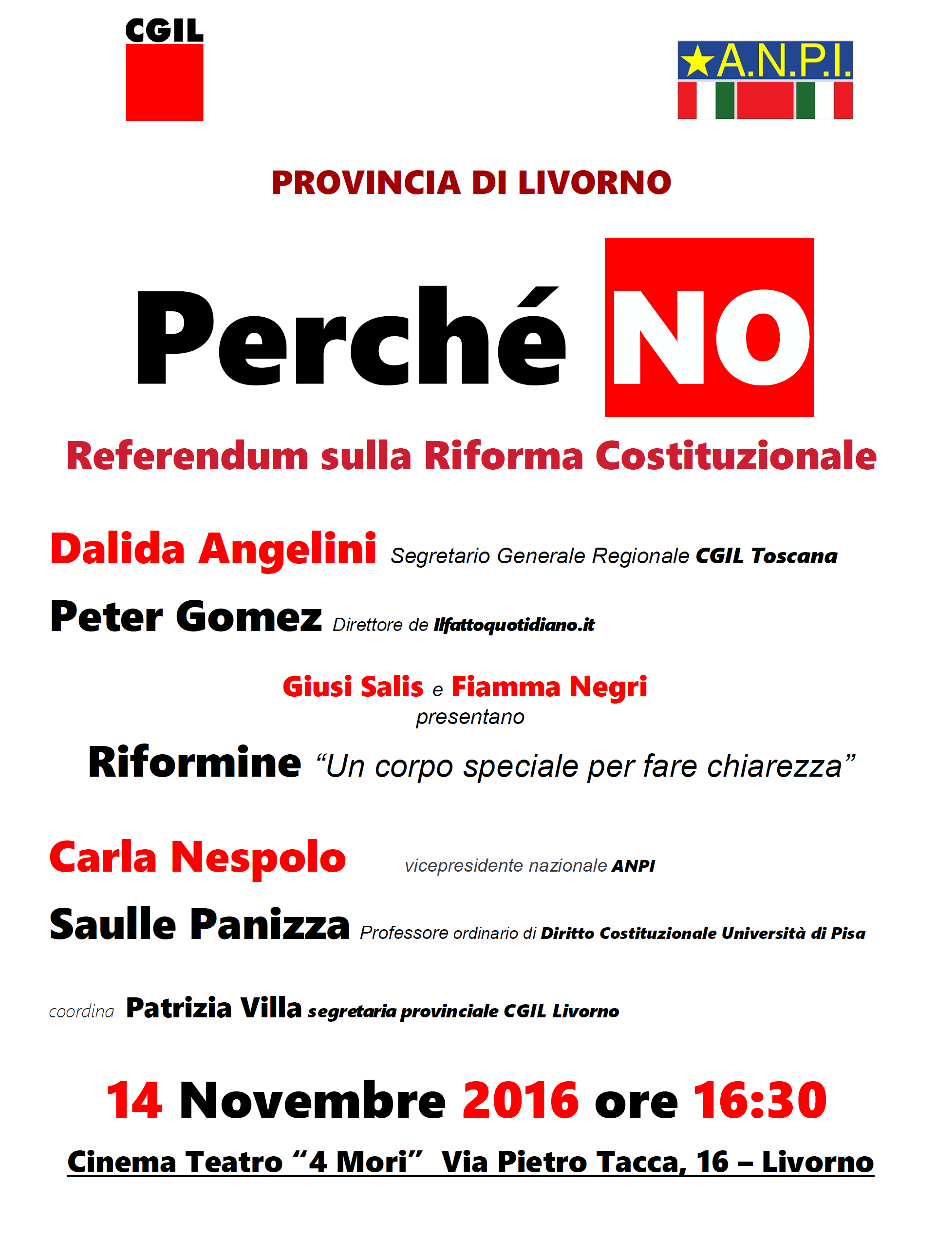 “Ci sarà un dibattito al cinema-teatro 4 Mori di Livorno il 14 novembre alle 16.30 – spiega Patrizia Villa, della segreteria confederale Cgil– e sarà un’occasione di confronto per approfondire le motivazioni per cui Cgil e Anpi hanno deciso di schierarsi per riportare il dibattito riguardante la Riforma Costituzionale all’interno di una discussione ampia e democratica, che non si traduca in un’eccessiva centralizzazione nelle mani del Governo dei poteri dello Stato”.
