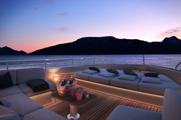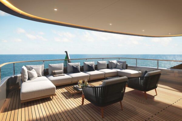 Gli interni sono in totale connessione con le terrazze di poppa: due sliding doors dalla forma curvata si aprono sul living del Main Deck e scompaiono lateralmente creando un unico openspace. Il salone è proposto in versione full lounge: una grande area declinata disegnata dalla fluidità delle forme dei divani che parlano di un arredo moderno e informale; l’area dining è nello skylounge dell’Upper Deck.