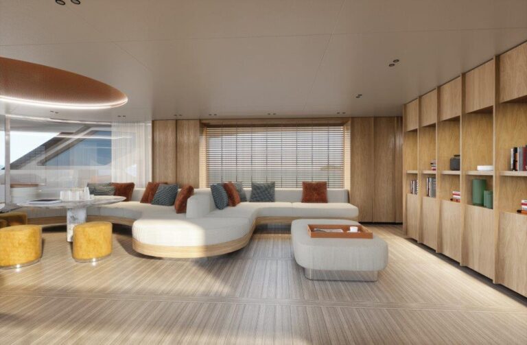 Lo studio Bonetti/Kozerski ha dato vita ad ambienti dall’atmosfera più disinvolta e il tema della fluidità degli spazi è evidente ovunque: nell’arredo, con la forma degli elementi, e nei dettagli di decoro, dove uno schema circolare ricorda le onde del mare. Due divani circolari seguono le linee tondeggianti delle vetrate, e invitano al relax del living interno; la parete di prua del salone è costituita da una libreria dalle geometrie lineari. Ovunque, aleggia una piacevole e apparente semplicità di stile data dall’uso di pochi ma pregiati materiali e dalla scelta di una palette cromatica limitata a poche nuance. Il teak a doga stretta degli esterni dialoga con la pavimentazione in legno di Main e Upper Deck con una tinta più chiara che rende gli ambienti più luminosi. Le finiture di arredi e paratie sono in rovere chiaro, concepite per lasciare il ruolo da protagoniste alle vetrate laterali che regalano impareggiabili viste sul mare.