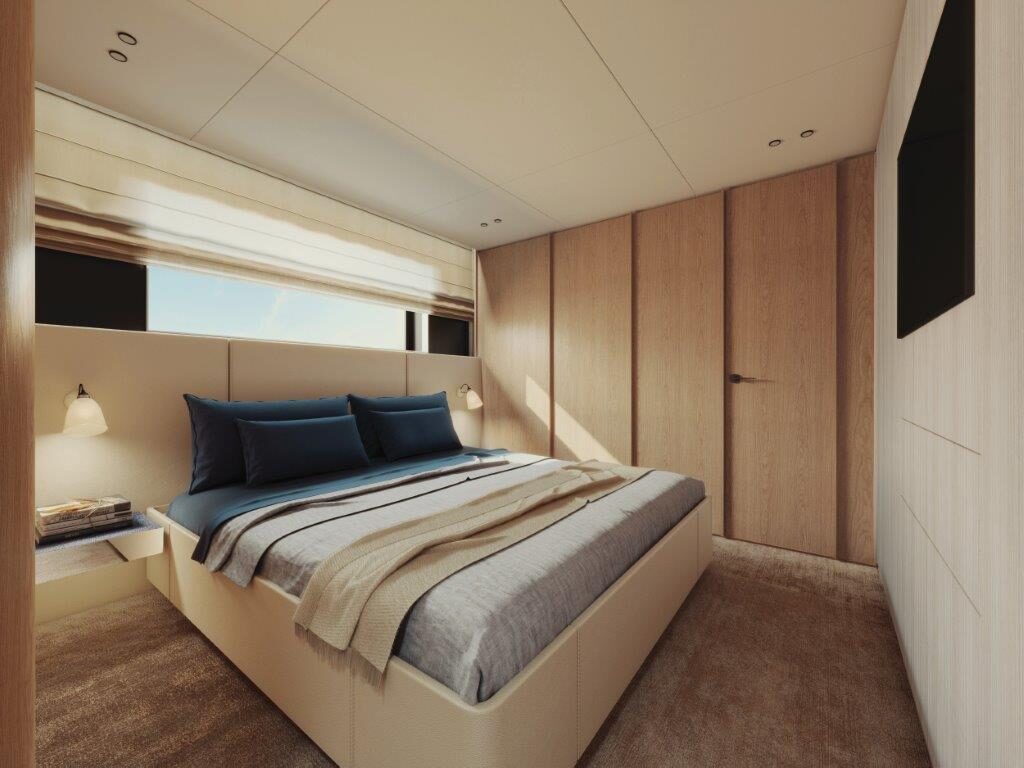La suite armatoriale, con finestrature a tutta altezza dallo stile essenziale ma ricercato, occupa l’intera parte prodiera del Main Deck ed è configurabile con un terrazzo abbattibile sul lato di dritta. Il letto sembra fluttuare nello spazio e trova ancoraggio sulla parete di poppa che funge da testata e da elemento divisorio con la sala bagno a tutto baglio, preceduta da una zona dressing su ambo i lati.