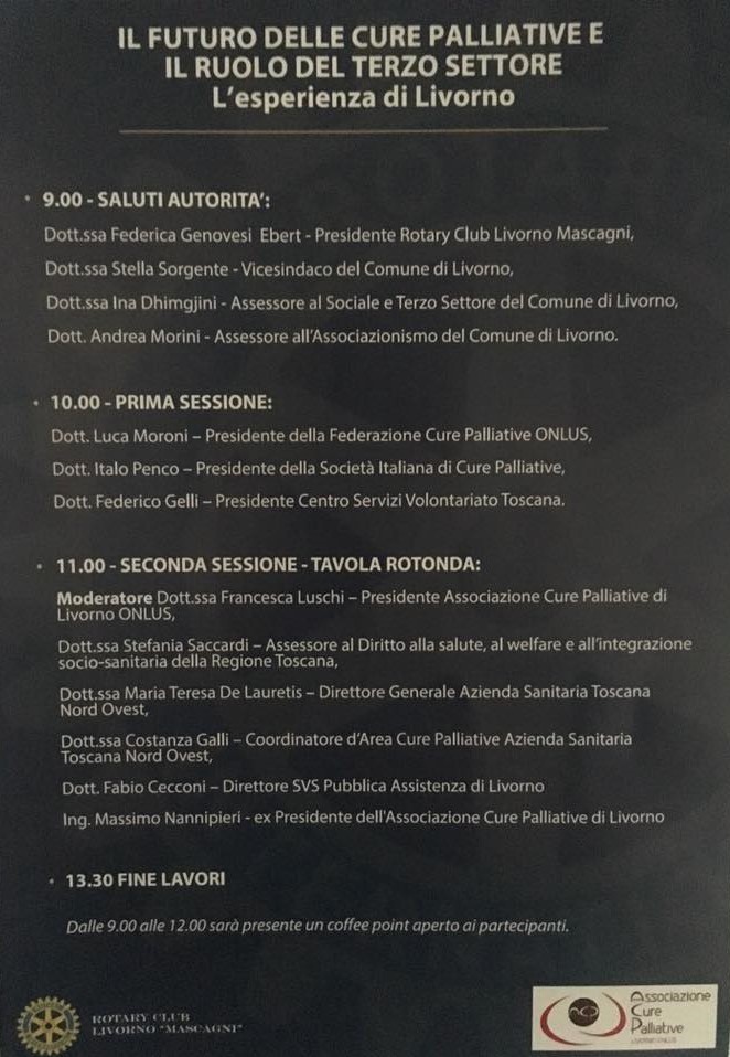 Il Convengo, dopo i saluti delle autorità, sarà diviso in due sessioni, di cui la seconda, la tavola rotonda, sarà fondamentale perché il Rotary Club Livorno Mascagni e l’Associazione Cure Palliative Livorno Onlus si augurano di riuscire ad avere una sorta di promessa e di favorire una regolamentizzazione per il settore delle cure palliative.