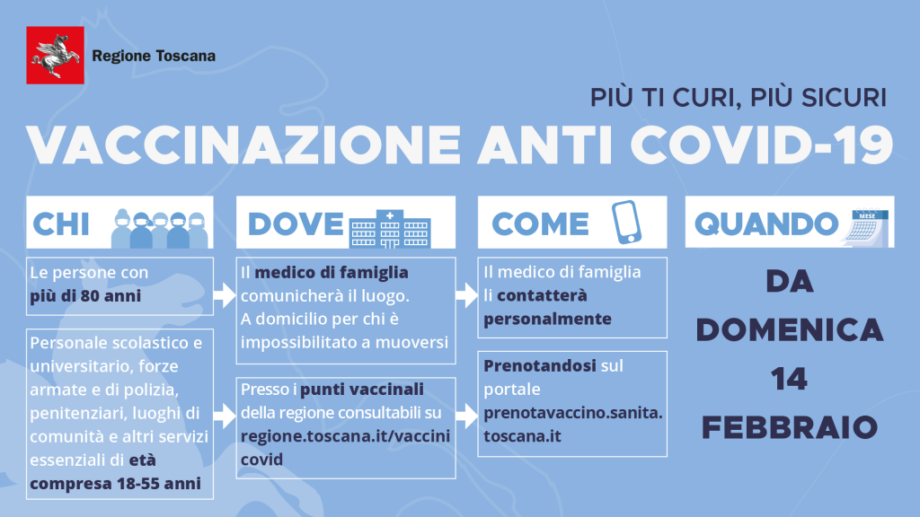 Da domenica 14 febbraio, giorno di San Valentino, la Toscana avvierà la somministrazione del nuovo vaccino AstraZeneca, coinvolgendo le categorie prioritarie con soggetti tra i 18 e i 55 anni, come previsto dal Piano nazionale (info grafica tratta dal post Fb del presidente Giani e qui potete trovare l’articolo sull’avvio dei test antigenici gratuiti per il personale scolastico). Il giorno successivo, a partire da lunedì 15 febbraio, prenderà il via, invece, la nuova fase della campagna, dedicata agli ultra ottantenni, ai quali saranno somministrati i vaccini Pfizer-BioNTech e Moderna. Una strategia di vaccinazione, questa, che si svolgerà in contemporanea e in modo parallelo, utilizzando tutti i vaccini al momento disponibili. Con la vaccinazione degli over 80 si avvia a completamento, dunque, la cosiddetta fase 1, che fino a oggi ha riguardato gli operatori sanitari e socio-sanitari, e il personale e gli ospiti delle rsa.