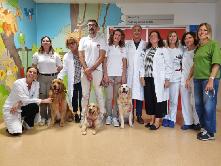 Wall-e, Eva e Joe arrivano a Pediatria per fare compagnia ai piccoli pazienti. I tre golden retriver, due maschi e una femmina, sono i cani bagnino della Scuola Italiana Cani Salvataggio sezione Toscana e da oggi, dopo una prova fatta a maggio, un martedì pomeriggio ogni 15 giorni saranno nel reparto diretto dal primario Roberto Danieli, dalle 15 alle 17, per regalare due ore di spensieratezza ai ricoverati. L’idea di questa iniziativa chiamata I cani bagnino fatto un tuffo in corsia è stata di una delle conduttrici Barbara Bonaccorsi: “Ero partita con l’intenzione di fare una donazione al reparto come ringraziamento dopo che mio figlio la vigilia di Natale 2022 è stato ricoverato dopo venti giorni di vita. E, anziché la classica donazione, con la dottoressa Dati e il dottor Danieli è nata l’idea di questo progetto”. Soddisfatto il primario: “Il ricovero per un bambino è un momento di disagio anche perché si trova in un ambiente diverso e con regole diverse. La presenza di questi tre meravigliosi cani allieterà per un paio d’ore la loro permanenza. Inoltre, la Pediatria di Livorno è una delle poche in Toscana in cui l’iniziativa è stata attivata e questo aspetto è per noi motivo di vanto”. Con Barbara erano presenti gli altri due conduttori Francesco Isetto e Marta Grieco e i dottori del reparto Petracchi, Dati e la coordinatrice delle infermiere Wust.