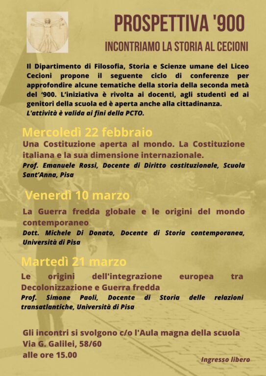 Mercoledì 22 febbraio, alle 15, all'interno dell’aula magna del Liceo “F. Cecioni” in via Galilei, prende il via il ciclo di conferenze sulla storia del secondo Novecento organizzato dal Dipartimento di Filosofia, Storia e Scienze umane della scuola
