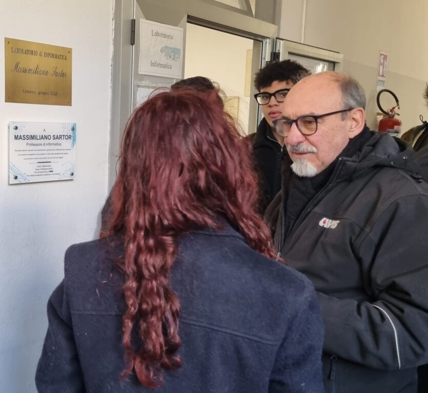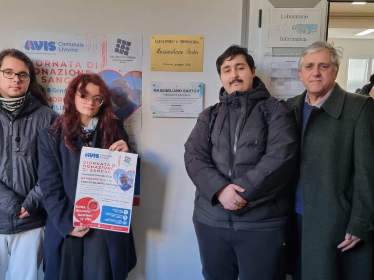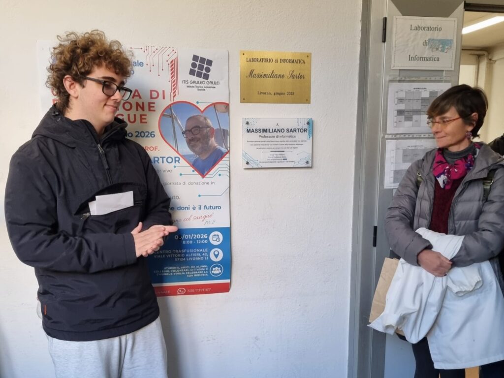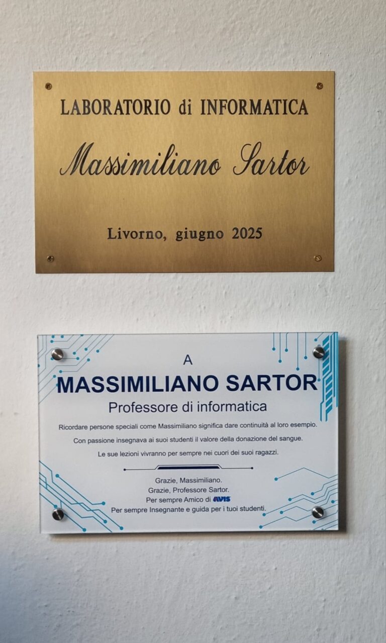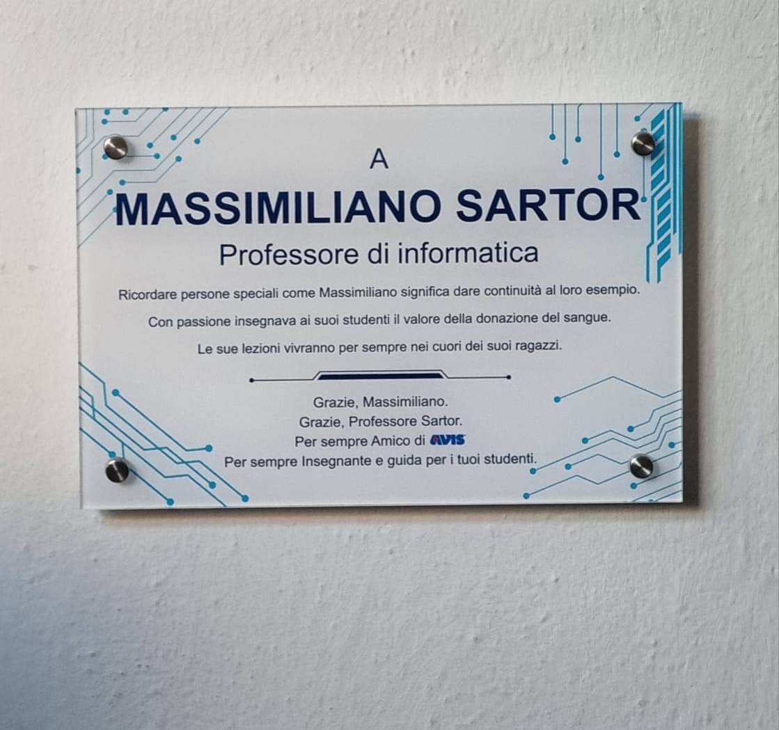 avrebbe compiuto 57 anni e per l’occasione l’Avis Comunale di Livorno, di cui l’insegnante faceva parte, ha promosso due iniziative in sua memoria. La mattinata si è aperta al Centro Trasfusionale dove una ventina di studenti, insieme ai docenti Fabio Barontini e Luisa Di Martino, hanno donato il sangue. Poche ma significative le parole della moglie Nadia, che ringraziamo per la disponibilità, presente al Centro Trasfusionale: “Massimiliano teneva tantissimo al tema della sensibilizzazione e sono sicura che oggi sarebbe stato contento del gesto compiuto dai suoi ragazzi”. A seguire, alla presenza del presidente Avis Antonio Cucè, del dirigente scolastico Antonio Manfredini, della collaboratrice del dirigente Susanna Giannetti e del collaboratore Andrea Menichetti, Avis ha scoperto la targa (“Ricordare persone speciali come Massimiliano significa dare continuità al loro esempio. Con passione insegnava ai suoi studenti il valore della donazione del sangue. Le sue lezioni vivranno per sempre nei cuori dei suoi ragazzi“) affissa all’ingresso del laboratorio di informatica sotto a quella già presente in suo ricordo. A rendere ancora più toccante il momento la presenza della ex classe di Sartor, la 4ª B INT (informatica e tecnologia) oggi 5ª B.