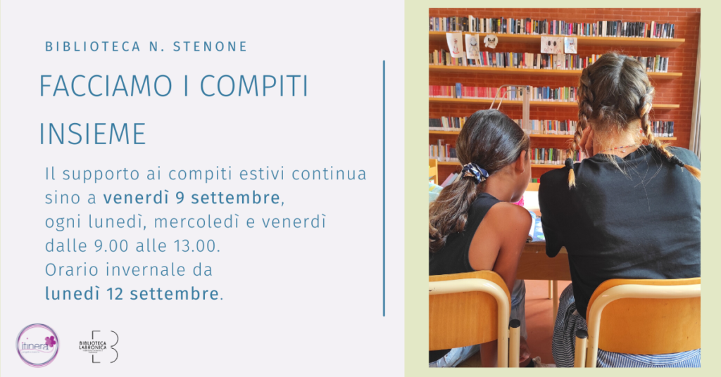 Personale qualificato della coop.Itinera è a disposizione per i bambini della scuola primaria ed i ragazzi delle scuole secondarie di primo grado mettendo in campo strategie didattiche mirate volte a facilitare il processo di apprendimento. È consigliata la prenotazione. Per info e prenotazioni chiamare la Biblioteca Stenone al numero 0586/440524 il lunedì, mercoledì, venerdì o scrivere all’indirizzo [email protected].