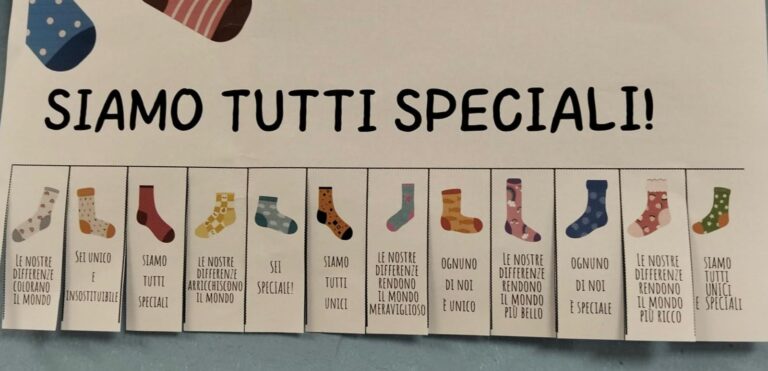 I calzini spaiati, colorati e diversi tra loro, sono diventati un potente simbolo educativo: un modo semplice ma efficace per ricordarci che, pur essendo diversi per aspetto, carattere, gusti, provenienze e abilità, tutte e tutti condividiamo gli stessi diritti e lo stesso valore. Ogni persona è unica e speciale e, proprio grazie a questa unicità, può contribuire in modo significativo alla vita della comunità.