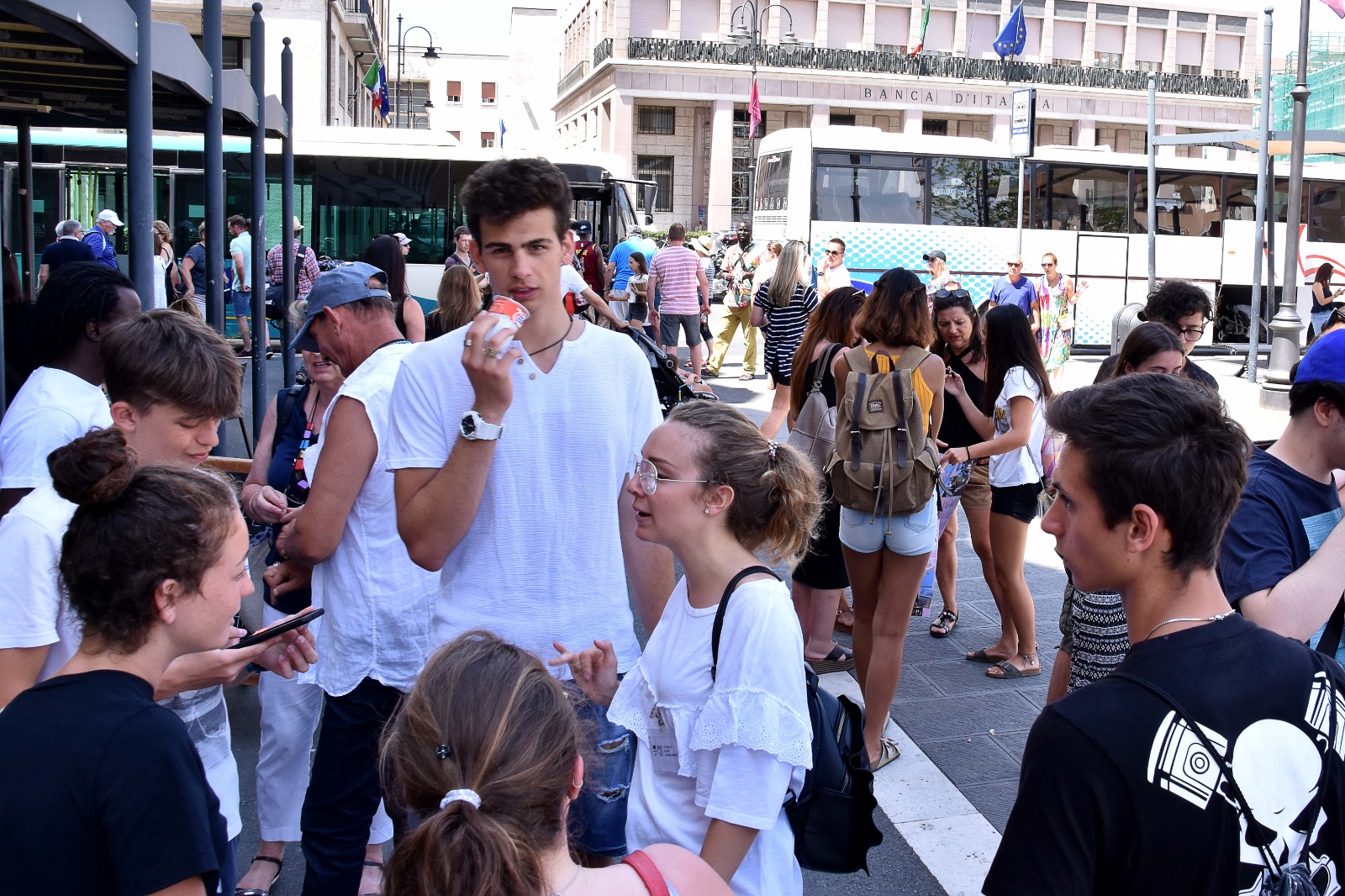 Il progetto “English in the Open Air” della associazione Eurocontact Plus Onlus, da sette anni all’arrivo delle navi da crociera, fa di piazza del Municipio un luogo dinamico di vitalità, di sorprese, di incontri tra visitatori e studenti, un interscambio di comunicazione pieno di energia, umana tensione per capirsi, per conoscersi, per accogliersi. Tutte persone sempre più vere, autentiche e sincere quando incontrano l’altro. Una festa. E come ben si sa, la festa ripristina la felicità, fa bene.