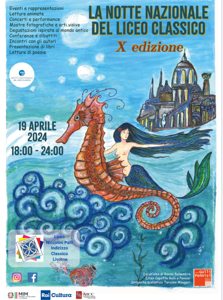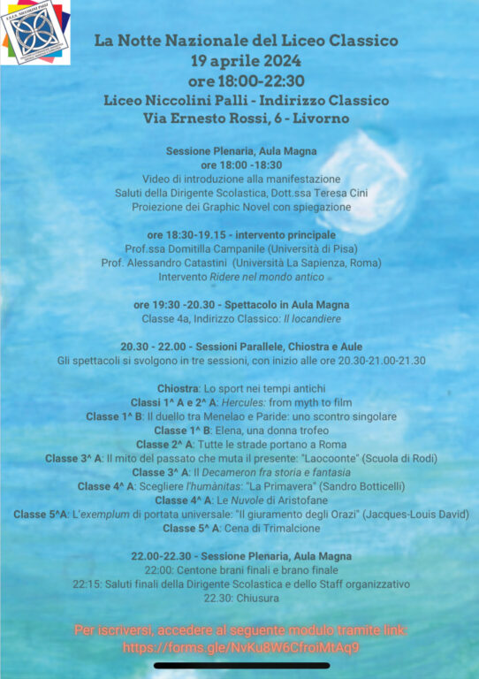 Anche quest’anno l’IIS Niccolini-Palli parteciperà alla Notte Nazionale del Liceo Classico. L’evento, nato da un’idea del prof. Rocco Schembra, sostenuto dal Ministero dell’Istruzione e del Merito e dall’Associazione Italiana di Cultura Classica, si terrà venerdì 19 aprile a partire dalle 18 in quasi 350 licei classici. In questa edizione, per la seconda volta, ai licei italiani si uniscono 14 licei stranieri: i Paesi coinvolti sono l’Australia, la Croazia, la Germania, la Grecia, la Francia, la Romania, la Spagna, la Turchia. Nell’ambito di un progetto che si propone di aprire le porte della scuola al territorio, la Notte Nazionale del Liceo Classico vuole essere un’occasione per far conoscere l’Istituto, promuovere lo studio della cultura classica e la validità del currricolo del Liceo Classico in tutta la sua complessità e versatilità. L’evento vedrà l’intervento della prof.ssa Domitilla Campanile (Università di Pisa) e del prof. Alessandro Catastini (Università La Sapienza Roma) che affronteranno il tema “Ridere nel mondo antico”. Protagonisti saranno gli studenti e le studentesse che presenteranno al pubblico il mondo classico in un’ottica interdisciplinare. La manifestazione è aperta a tutte le componenti della scuola e alla cittadinanza.