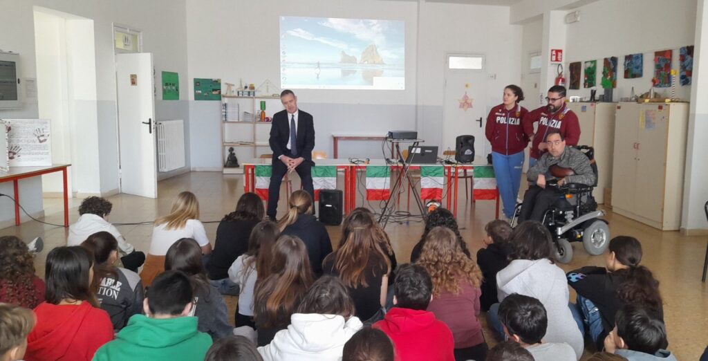 Il vicario della polizia Matteucci – insieme agli atleti delle fiamme oro Marco Vannini e Vittoria Ciampalini, al garante delle persone disabili Valerio Vergili e al presidente dell’associazione Paraplegici Livorno Fabrizio Torsi – ha incontrato un centinaio di studenti dell’IC Carducci di Livorno per parlare di inclusione e rispetto delle regole. La questura nei mesi di aprile e maggio proseguirà, con la collaborazione dell’Ufficio Scolastico Provinciale, il percorso progettuale incentrato sulla legalità dal titolo #sceglilastradaGIUSTA che vedrà coinvolti gli studenti delle istituti scolastici di Livorno e provincia nella partecipazione ad incontri che si svolgeranno direttamente nelle scuole dove verranno creati momenti di riflessione incentrati sulla cultura delle regole e sulla valorizzazione delle disabilità, direttamente collegati con lo sport, fornendo attraverso l’esempio degli atleti il proprio contributo a favore del cambiamento in positivo della percezione delle diversità. Gli incontri saranno curati dal maestro di scherma della Sezione giovanile della polizia Marco Vannini e dall’atleta Vittoria Ciampalini, dal presidente dell’Associazione Paraplegici Fabrizio Torsi, nonché poliziotto ad honorem, e dal garante dei diritti delle persone con disabilità Valerio Vergili. Anche quest’anno la partecipazione di Fabrizio e di Valerio, attraverso il racconto delle proprie storie di vita e di difficoltà, ha lo scopo di impreziosire il messaggio di inclusione e di superamento delle difficoltà da rivolgere ai giovani. Con questo progetto la polizia intende trasmettere agli studenti cui si rivolge l’importanza dell’inclusione intesa come scambio culturale ed integrazione delle persone diversamente abili partendo dallo sport quale mezzo di diffusione del rispetto delle regole, delle necessità ed esigenze di tutti, divenendo quindi fonte e motore di inclusione sociale, ovvero strumento eccellente per l’integrazione di qualunque cittadino. Il 5 aprile sarà la volta dell’IC Guerrazzi di Cecina.