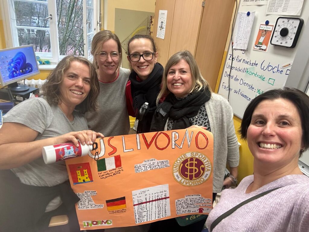 Durante uno dei momenti più significativi dello scambio, le insegnanti tedesche insieme ai ragazzi e alle ragazze della classe 6B hanno realizzato una sorprendente presentazione dedicata alla squadra dell’Unione Sportiva Livorno 1915. Formazione, classifica, curiosità e un affettuoso riferimento allo stadio Armando Picchi: un lavoro accurato che dimostra quanto la cultura sportiva possa unire territori lontani.