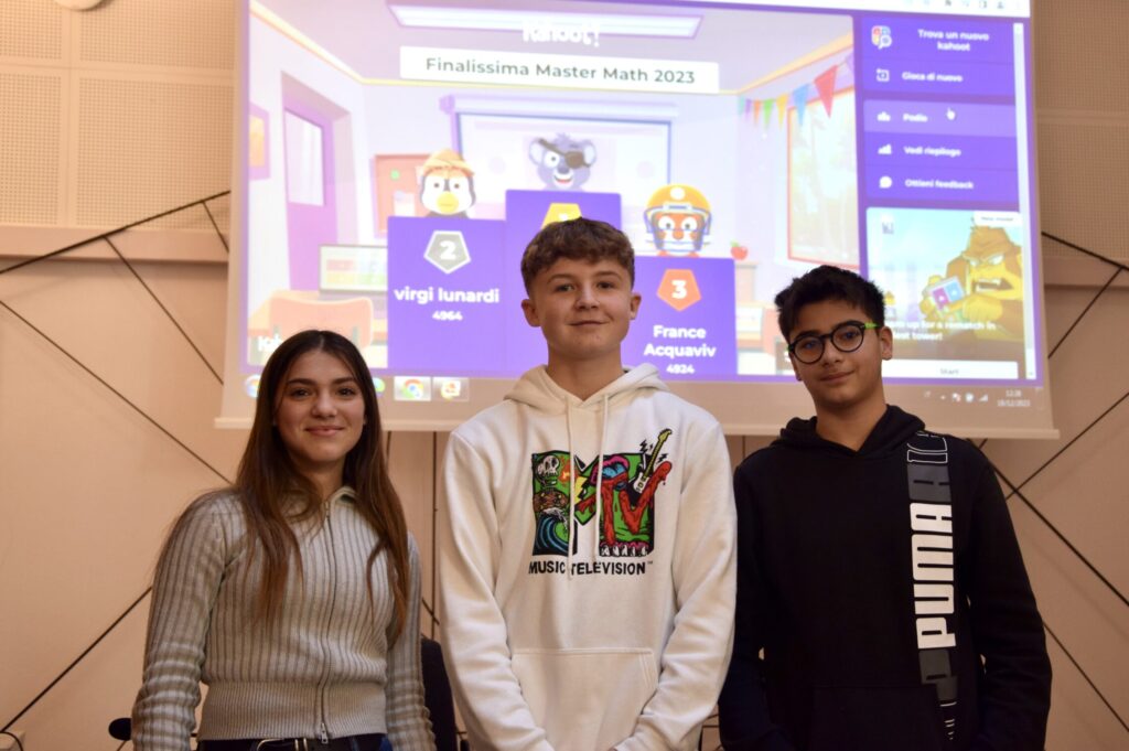 Il podio di Master Math 2023: Lorenzo (primo posto), Virginia (seconda), Francesco (terzo)