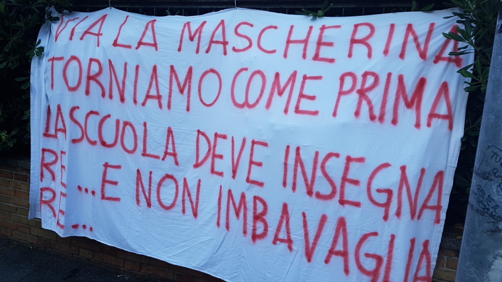 “Via la mascherina torniamo come prima. La scuola deve insegnare… e non imbavagliare”. Resterà un piccolo mistero, almeno ad ora lo è, lo striscione di protesta di circa 2 metri (nella foto prima che venisse rimosso) comparso il 16 giugno mattina all’esterno della scuola media Mazzini in via Tozzetti. Una cosa è certa. “Ovviamente non è stata una nostra iniziativa. La nostra scuola disconosce assolutamente questo striscione – ha commentato il dirigente scolastico Rino Bucci raggiunto telefonicamente da QuiLivorno.it – Non sappiamo chi sia stato, mi sento però di dire che non siano stati i nostri studenti vista l’età (i più grandi hanno 13 anni, ndr). Mi auguro non capiti più”. E’ stato lo stesso preside a trovarlo una volta giunto al lavoro, a rimuoverlo e ad informare dell’accaduto le forze dell’ordine. “Colgo l’occasione per ringraziare i carabinieri prontamente intervenuti. Sono stati gentilissimi”.
