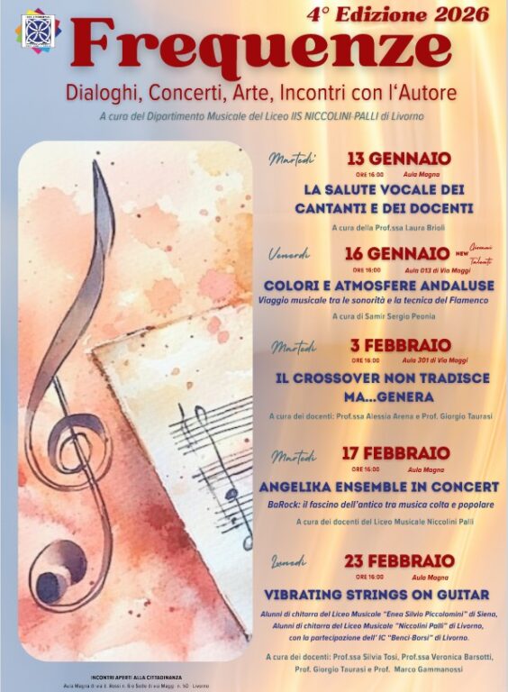 Al via, con i primi due appuntamenti di gennaio, la 4a edizione di “Frequenze: Dialoghi, Concerti, Arte, Incontri con l’Autore” promossa dalla Dirigente Scolastica Teresa Cini e organizzata dal Dipartimento del Liceo Musicale Niccolini Palli di Livorno, a cura della Prof.ssa Veronica Barsotti. Il ciclo di incontri “Frequenze” è aperto a studenti/studentesse del Liceo e alla cittadinanza ed è nato con lo scopo di far conoscere varie realtà musicali e approfondire tematiche a carattere musicale attraverso l’incontro con autori e musicisti attivi nel territorio labronico e non solo. Martedì 13 gennaio alle ore 16:00 nell’Aula Magna del Liceo Niccolini – Palli di Livorno si terrà il primo appuntamento curato dalla Prof.ssa Laura Brioli che tratterà il tema: “La salute vocale dei cantanti e dei docenti”, ovvero le strategie, le buone pratiche che aiutano a salvaguardare l’organo vocale per coloro che lo impiegano nell’esercizio della loro professione. Laura Brioli, riccionese di nascita ma livornese di adozione, è una delle più interessanti voci italiane di mezzosoprano. Ha cantato nei maggiori teatri italiani e esteri, collaborando con i più importanti direttori d’orchestra tra cui Philippe Auguin, Daniele Callegari, Giuliano Carella, Myung-Wung Chung, Massimo de Bernart, Placido Domingo, Asher Fish, Gian Luigi Gelmetti, Alain Lombard, Fabio Luisi, Fabio Mastrangelo, Zubin Metha, John Neschling, Claudio Scimone, Marcello Viotti, Alberto Zedda. Dal 2014 è docente di Canto presso il Liceo Musicale Niccolini Palli di Livorno. Laureata in Lingue e Letterature straniere dal 2014 è docente di Lingua Inglese e Tedesca presso numerosi Conservatori Italiani. E’ Maestro del Coro Voci Bianche del Teatro Goldoni di Livorno. Tiene Masterclasses di canto lirico a livello internazionale. Venerdì 16 gennaio alle ore 16:00 alla sede di via Maggi del Liceo Niccolini – Palli di Livorno si terrà il secondo appuntamento dal titolo “Colori e atmosfere andaluse”, un viaggio musicale tra le sonorità e la tecnica del Flamenco, a cura di Samir Sergio Peonia. Samir Sergio Peonia è un giovane chitarrista virtuoso che si è già esibito a livello nazionale ed internazionale in prestigiose sedi. E’ risultato vincitore del concorso Internazionale “Sete Sois Sete Luas” che lo ha portato ad esibirsi in una tournée in Portogallo. Inizia giovanissimo lo studio della chitarra classica all’Accademia di Musica di Pontedera con Veronica Barsotti proseguendo poi gli studi al Liceo Musicale “G. Carducci” di Pisa con i Maestri Giordano Bindi e Fabio De Ranieri. La passione per il flamenco lo ha portato ad approfondirne la tecnica, la storia, l’improvvisazione e a comporre brani musicali con la chitarra al fine di sperimentare le possibilità tecniche e sonore dello strumento. Ha seguito le lezioni e Masterclasses con i Maestri Juan Lorenzo e Manolo Franco a Lugano. Attualmente continua lo studio della chitarra classica preparando l’esame per accedere alla Laurea Triennale presso L’Istituto di Alta Formazione Artistica “G. Puccini” di La Spezia.