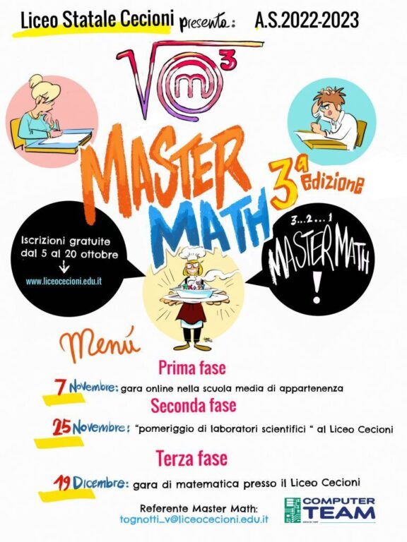 Matematica? Al Cecioni, Sì grazie. Si sa che la matematica è tra le materie che incutono timore (a volte terrore) a studenti e studentesse di ogni età e che l’opinione comune vuole che ci voglia una “mente bestiale” (parafrasando una famosa canzone) per sconfiggere problemi e equazioni. Superiamo i luoghi comuni e dimostriamo che la matematica si può capire e anzi ci si può anche giocare e divertirsi. Come? Con MasterMath2022, il progetto scientifico per gli studenti della terza media delle scuole cittadine, lanciato dal Liceo Cecioni e alla sua terza edizione, dopo lo stop pandemico. Quest’anno si sono iscritte ben ventuno classi da cui, con una gara on line, sono stati selezionati 103 alunni e alunne che parteciperanno ad un pomeriggio di “attività scientifiche” al liceo Cecioni. Infine il 19 dicembre, tutti i 103 iscritti, presso il liceo di via Galilei, disputeranno una semifinale a base di divertenti problemi logici matematici, da cui usciranno 10 finalisti che si sfideranno, nella stessa mattina, in un quiz online con i loro smartphone davanti a tutta la platea. Uno solo, purtroppo, il vincitore o la vincitrice; per lui o per lei un premio importante, offerto dalla ditta Computer Team: un pc portatile. Qualcuno ha ancora paura della matematica?