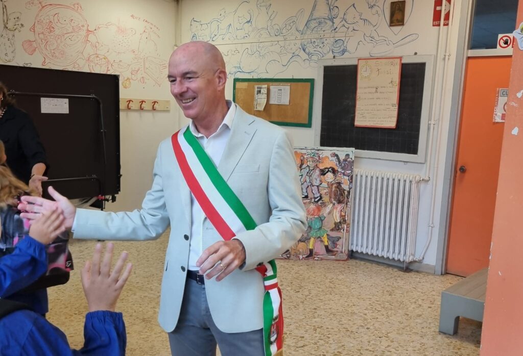 Il saluto del sindaco Salvetti stamattina alle Rodari accolto dalla dirigente scolastica Elena Rossi