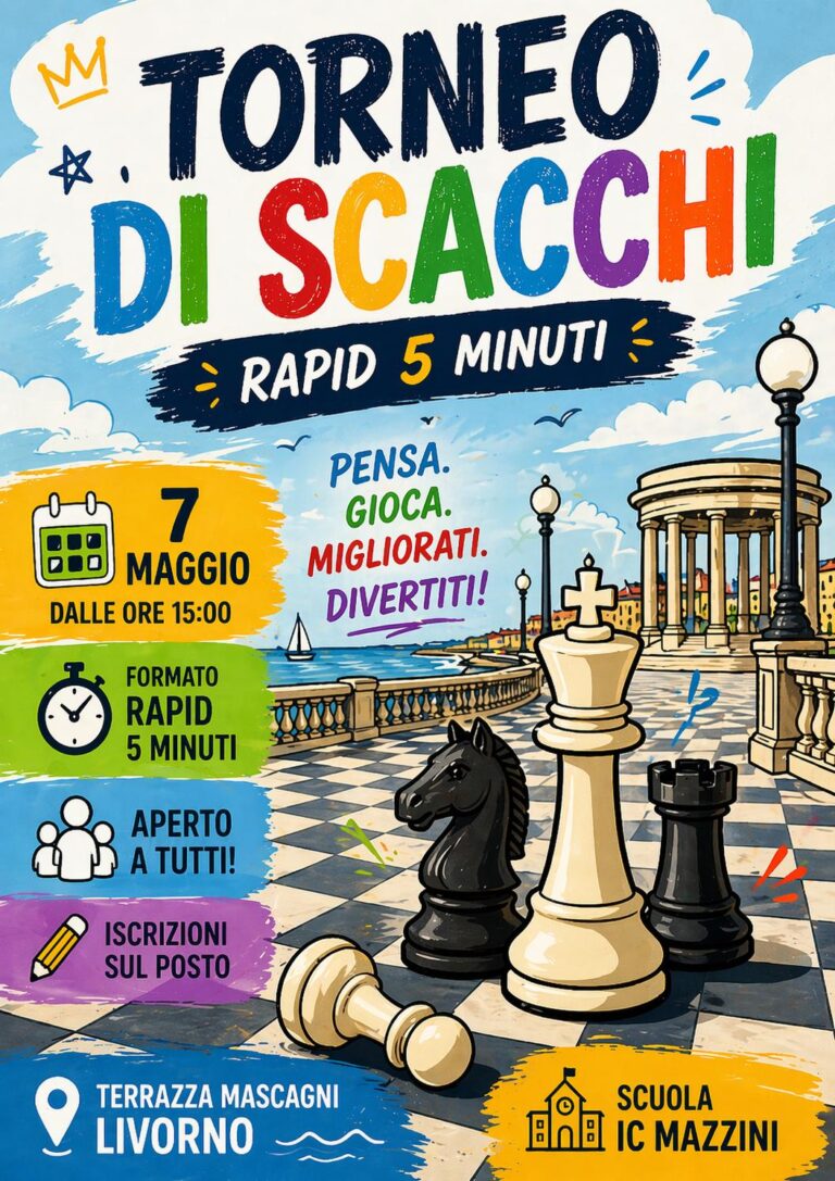 Il progetto scacchi dell’Istituto Comprensivo “G. Mazzini” arriva al suo gran finale. Il corso, tenuto dal professor Massanova e organizzato con la collaborazione delle professoresse Caposciutti e Tramonti, si concluderà il 7 maggio a partire dalle ore 15:00, nella splendida cornice della Terrazza Mascagni, dove studenti e appassionati si sfideranno in riva al mare. L’iniziativa, realizzata in stretta collaborazione con l’Associazione Scacchisti Livorno, non sarà solo un momento di competizione, ma una vera festa per gli amanti della logica e della strategia. Il pubblico potrà assistere a due diverse modalità di gioco: da una parte il torneo “Open Rapid”, dove la velocità di pensiero è tutto (5 minuti a testa per concludere la partita), e dall’altra la spettacolare Sfida Gigante. Per l’occasione verranno infatti utilizzate pedine alte un metro, acquistate grazie al contributo della Fondazione Livorno, che tramite un bando ha permesso alla scuola di dotarsi di questi strumenti unici. L’evento è pensato per essere inclusivo: oltre agli studenti che hanno frequentato il corso, anche passanti e appassionati potranno iscriversi al momento (fino a esaurimento posti) e mettersi alla prova sulla scacchiera. Un’occasione per vedere i giovani talenti livornesi all’opera e per riscoprire il fascino di un gioco millenario che, grazie alla collaborazione tra scuola, associazioni e istituzioni, continua a crescere nel cuore della città.
