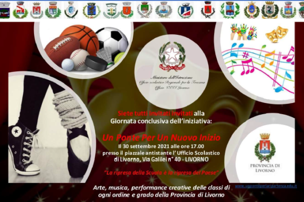 Giovedì 30 settembre 2021 alle 17 segnerà per la provincia di Livorno – alla presenza del Direttore Generale dell’Ufficio Scolastico Regionale per la Toscana, Dottor Ernesto Pellecchia – la conclusione del progetto Nazionale ed il vero e proprio inizio del nuovo anno scolastico con un evento che si terrà presso il piazzale antistante l’Ufficio Scolastico di Livorno (via Galilei 40 – LIVORNO) dal titolo “Un Ponte Per Un Nuovo Inizio”. Durante tale evento tutte le scuole della provincia di Livorno, in presenza o attraverso interventi online, metteranno a disposizione della cittadinanza il risultato della loro voglia di ripartire per augurare a tutti un Buon Anno Scolastico pieno di “Scuola, di spazi e tempi di relazione, e luoghi per incontrarsi di nuovo e riannodare quelle relazioni interrotte, importanti per lo sviluppo emotivo, affettivo, identitario, sociale di ognuno”.