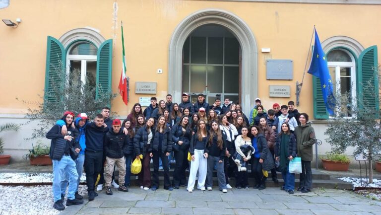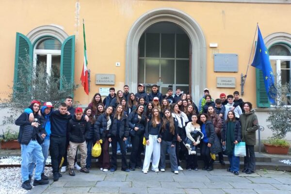 Accolti in giardino da cartelloni di benvenuto realizzati per il loro arrivo dai ragazzi e dalle ragazze del “Laboratorio di creatività” hanno preso posto in aula magna dove coro e orchestra del Liceo musicale hanno offerto con entusiasmo il loro saluto in musica. La mattinata si è conclusa con lo scambio di doni con la dirigente Teresa Cini e poi al Teatro Goldoni per una visita guidata e una seconda performance musicale. La visita è stata promossa dal presidente dell’Associazione Borgo dei Greci di Livorno. Il saluto al gruppo è avvenuto infine all’interno del Mercato Centrale, dove ragazzi e ragazze hanno consumato uno spuntino prima di rimettersi in pullman diretti verso la tappa successiva del loro viaggio di istruzione