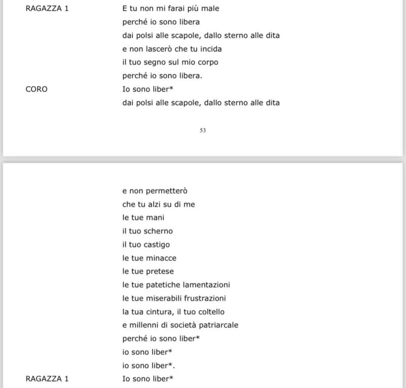Immagine tratta dalla pagina Instagram Studentiliceoenriques durante la lettura da parte della rappresentante di istituto di un documento condiviso inerente al tema che si è aperto con una citazione della poesia di Cristina Torre Cáceres letta da Elena Cecchettin, "Se domani non torno...”; nella seconda immagine la parte finale del testo dello spettacolo teatrale dello scorso anno letto dal gruppo teatrale del Cecioni; nella terza la panchina "a tema" presente all'Orlando relativa ad un lavoro fatto dai ragazzi della classe 5 C Mat nell’anno scolastico 21-22